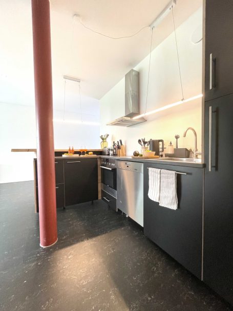 Die zum Wohnbereich hin offene Küche in L-Form ist ausgestattet mit einem Herd mit Backofen, Geschirrspüler, einem großen Kühlschrank und einer Bar mit Hockern von Hay.