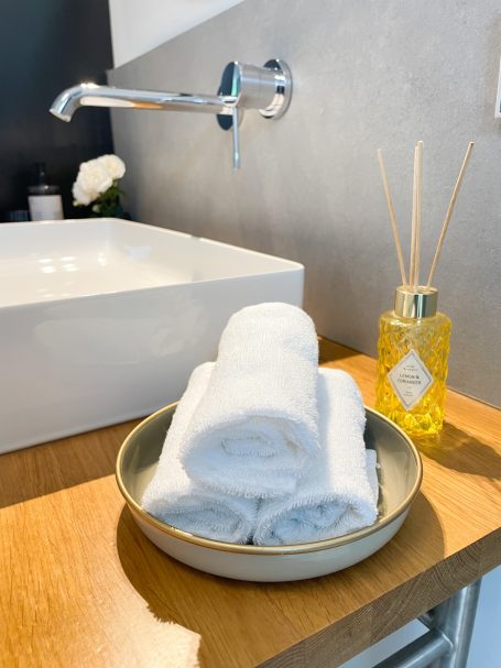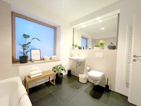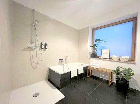 Im großzügigen Wohlfühlbad mit Badewanne, bodengleicher Dusche, flauschigen Handtüchern und hochwertigen Pflegeprodukten startest du in einen erlebnisreichen Tag.