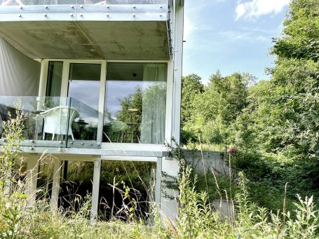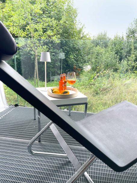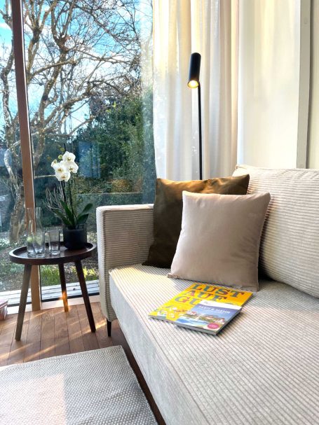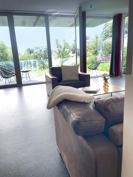 Das Wohnzimmer ist großflächig verglast und bietet einen idyllischen Blick in die Natur. Neben einem hellen Essbereich (Tisch mit 4 Stühlen) findet ihr ein Loungesofa, das bei Bedarf zum Doppelbett (180 x 200) aufgeklappt werden kann. Zusätzlich TV, Bücher, Magazine und Spiele. Im überdachten Süd-Balkon findet ihr einen weiteren Essplatz mit Loom-Korbsesseln zum Relaxen und für den Sundowner.