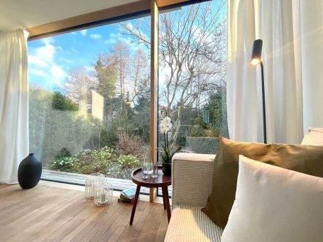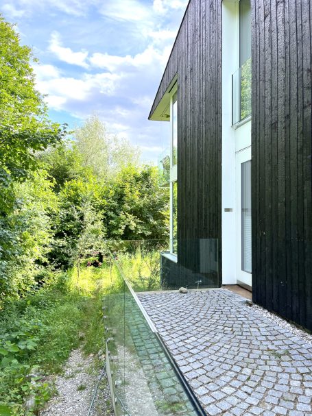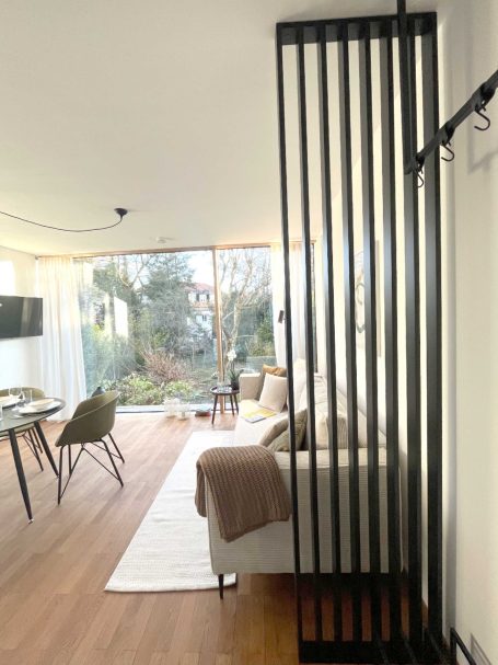 Das 2 Zimmer Apartment mit eigenem Eingang befindet sich in einem modernen Architektenhaus in ruhiger und grüner Wohnlage von Tutzing. Besonderer Wert wurde auf biologische Baumaterialien, ein automatisches Lüftungssystem und gesunde Raumfarben der Firma Keim gelegt. Es empfängt dich ein offener, modern eingerichteter Wohnraum mit Glasfront, offenem Küchen- und Essbereich für bis zu 4 Personen sowie einem traumhaften Blick in den Garten. Das gemütliche Sofa mit Schlaffunktion (190 x 145 cm) lädt zum Lesen, Entspannen oder Fernsehen per Smart-TV ein. Das Schlafzimmer kann vom Wohnraum durch eine Schiebetür abgetrennt werden.