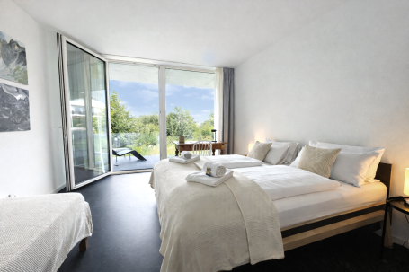 Im Wohnzimmer mit Sitzbereich (Dreisitzer-Ledersofa und Sessel) und Arbeitsplatz befindet sich ein weiteres optisch abgetrenntes Doppelbett (180x200). Der großzügige Wohn-Essbereich ist nach Süden komplett verglast, lässt Licht und die Natur ins Apartment und bietet ein fantastisches Wohngefühl.