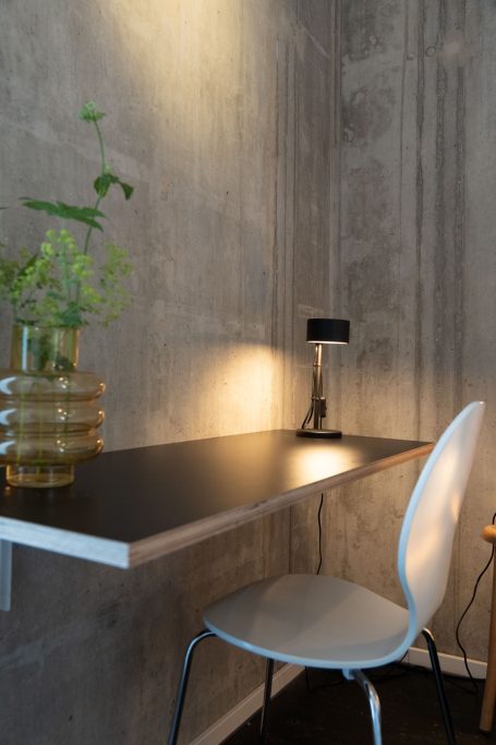 Vom großzügigen Eingangsbereich kommt ihr ins Schlafzimmer mit Kingsize-Doppelbett (180 x 200) und einem ruhigen Arbeitsplatz mit Stuhl und Lampe (Babybett und Hochstuhl auf Anfrage).