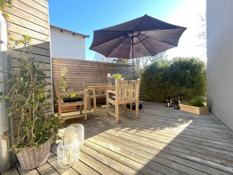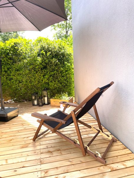 Die Terrasse mit gemütlichen Teakmöbeln und Liegestühlen lädt zu einem entspannten Frühstück mit leckerem Café aus der eigenen Nespresso Kaffeemaschine ein.