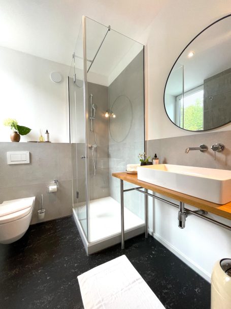 Im Bad findet ihr eine Dusche, WC (barrierefrei), Waschtisch und ein bodentiefes Fenster.