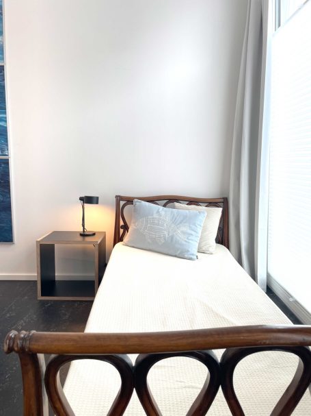 Wir legen viel Wert auf erstklassigen Schlaf. Deshalb erwartet dich im angrenzenden Schlafzimmer ein Queen-Size Boxspringbett (160 x 200 cm), natürlich ausgestattet mit hochwertiger Bettwäsche und einer Kissenauswahl auf Hotelniveau. Babybett und Hochstuhl auf Anfrage.