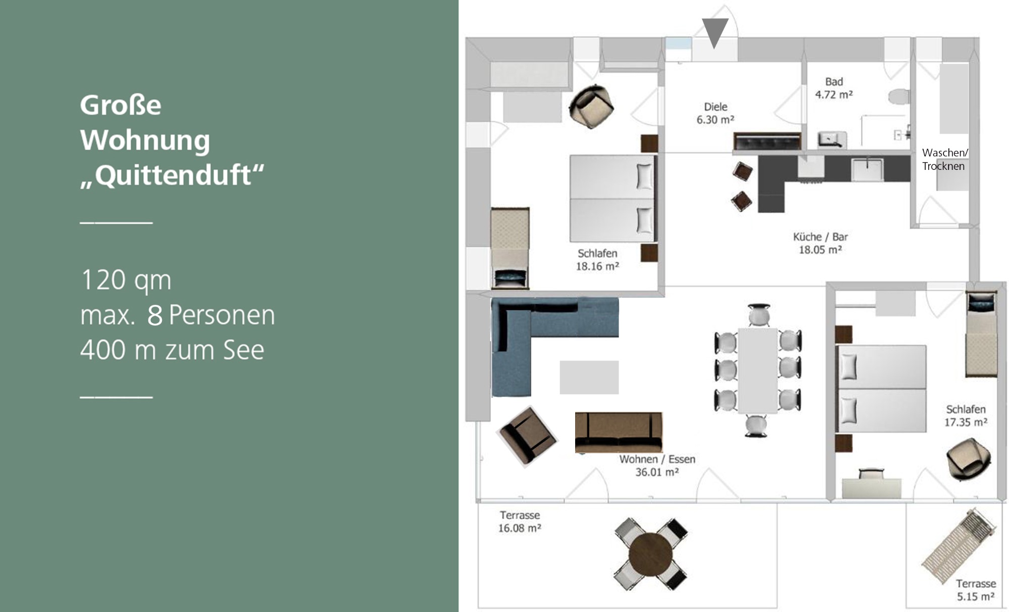 Die moderne und großzügige Ferienwohnung Quittenduft mit 120 m² für bis zu 8 Personen, hat zwei große Schlafzimmer mit je einem Design-Doppelbett (180 x 200) und einem dritten Bett (90 x 200).