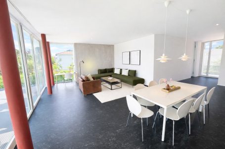 Im Wohnzimmer mit Sitzbereich (Dreisitzer-Ledersofa und Sessel) und Arbeitsplatz befindet sich ein weiteres optisch abgetrenntes Doppelbett (180x200). Der großzügige Wohn-Essbereich ist nach Süden komplett verglast, lässt Licht und die Natur ins Apartment und bietet ein fantastisches Wohngefühl.